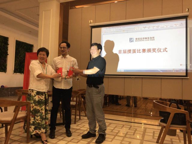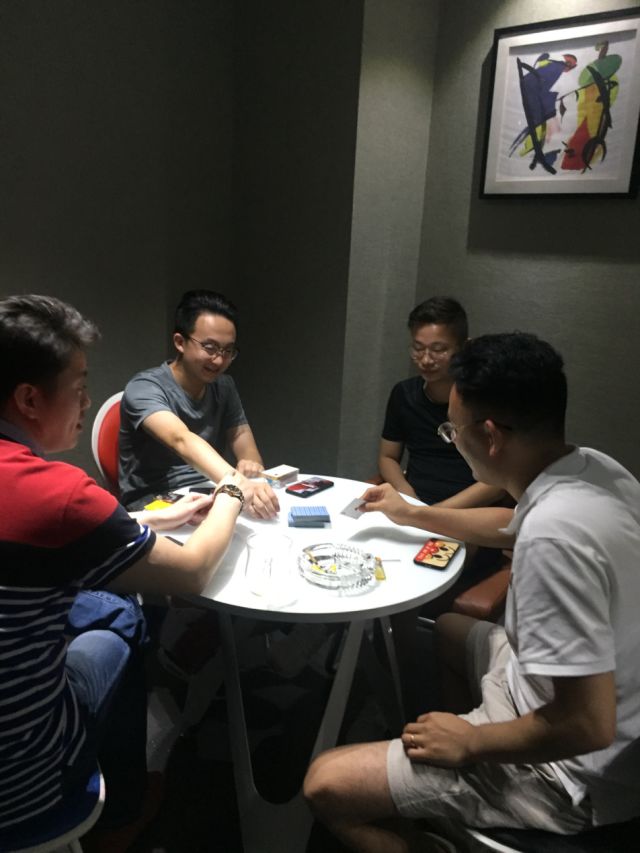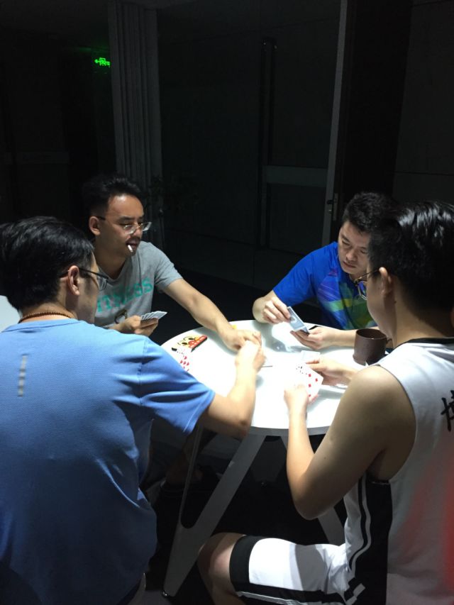 下午,博爱星首届掼蛋比赛也在江阴分所办公大楼里的公共空间举办。由16位选手组成8对,分成4组,经过第一轮淘汰赛,获胜的选手进入前4名;第二轮获胜后的2对选手进入冠亚军决赛。