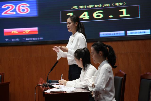 上场的美女们,一改平时的柔弱,个个变身为铿锵玫瑰。李婷,更是自告奋勇地承担了“怼”的任务,积极分担二辩的重压;张梦琪,伶牙俐齿的姑娘,在场上面对强大的对手毫不示弱,逐一将对手的问题一一予以回击;三辩高洋,虽很瘦弱,但是气势并不弱,陈词时的煽情充满了文艺腔。